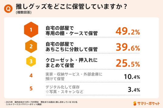 グッズの保管場所について尋ねたところ、最も多かったのは「専用の棚・ケースで保管している」で49.2%に上りました。推しグッズをインテリアとして飾ったり、コレクションとして整理・鑑賞しながら楽しむ様子がうかがえます。