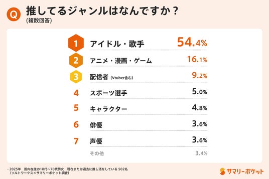 また、推し活の対象となるジャンルにも多様性が広がっています。「アイドル・歌手」が54.4%で過半数を占めているものの、「アニメ・漫画・ゲーム」(16.1%)や「配信者・VTuber」(9.2%)など、従来の枠を超えて多岐にわたるジャンルで“推し”を応援する人が増えていることが明らかになりました。