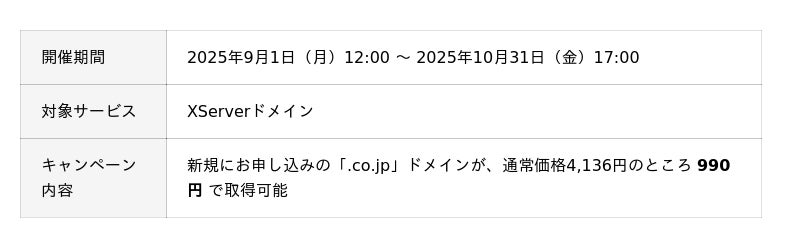 エックスサーバー株式会社(所在地:大阪市北区、代表取締役:小林 尚希)は、2025年9月1日(月)から2025年10月31日(金)までの期間、国内成長率No.1(※1)のドメイン取得サービス『XServerドメイン』において、法人専用「.co.jp」ドメインの新規取得費用を、通常価格4,136円から《990円》へ大幅値下げする特別キャンペーンを実施しています。