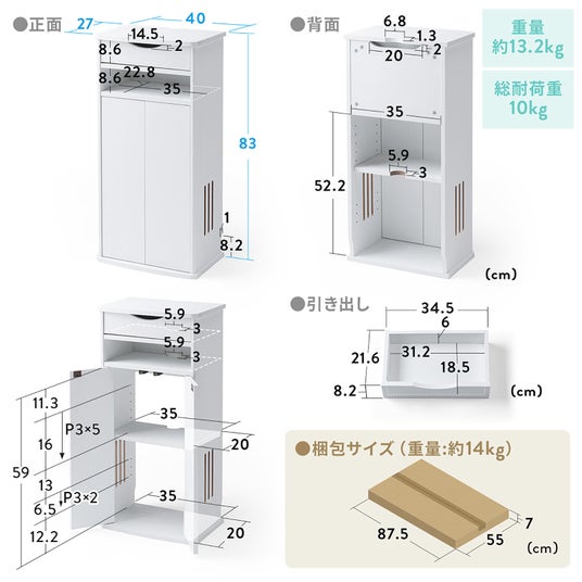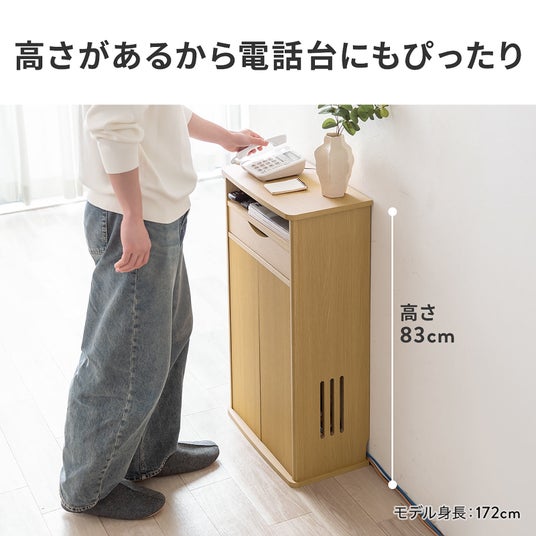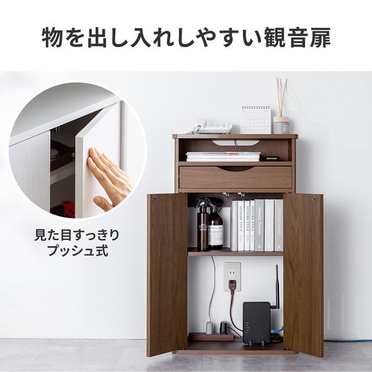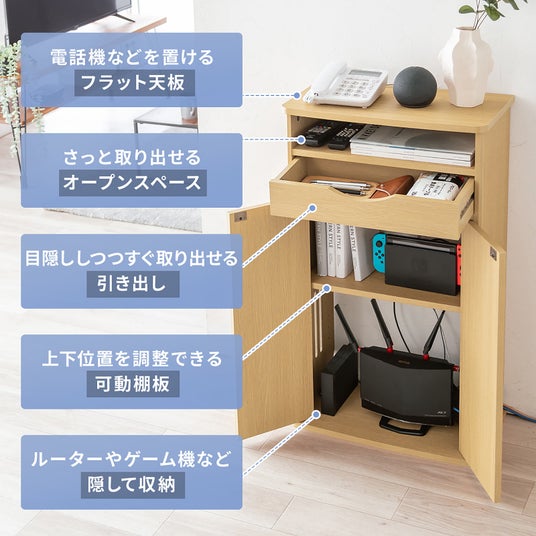 扉と小物の整理に便利な引き出し付きで、大型ルーターやモデム、電源タップや生活雑貨が収納でき、電話台としても使用できる木製収納ラック