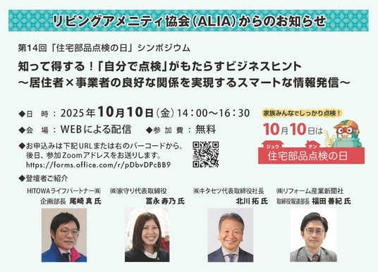 住宅設備・建材メーカーで主に組織される一般社団法人リビングアメニティ協会ALIA(本部:千代田区、会長:内藤弘康)は、住宅設備・建材の点検・お手入れの文化を広めるため、2025年10月10日(金)に「第14回住宅部品点検の日シンポジウム」をZoomウェビナーにて開催します。