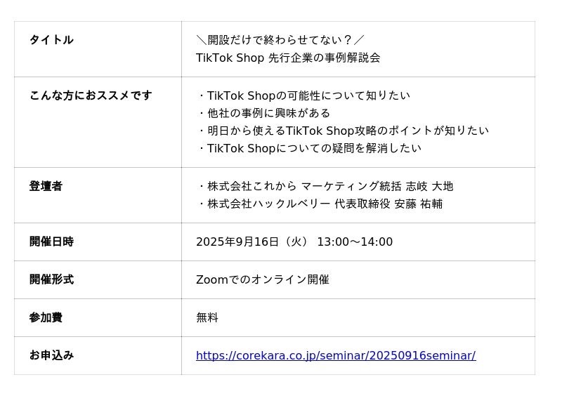 業務連携を記念してTikTok Shop事例セミナーを開催します!これからTikTok Shopに挑戦したい方、すでに始めたけれど伸び悩んでいる方、そして最新の事例をいち早くキャッチアップしたい方におすすめです。