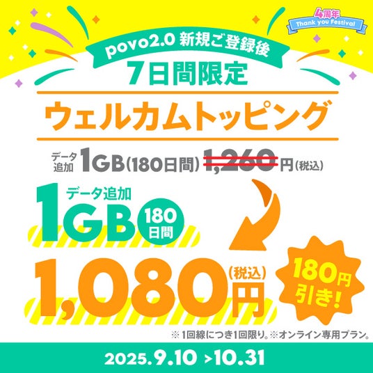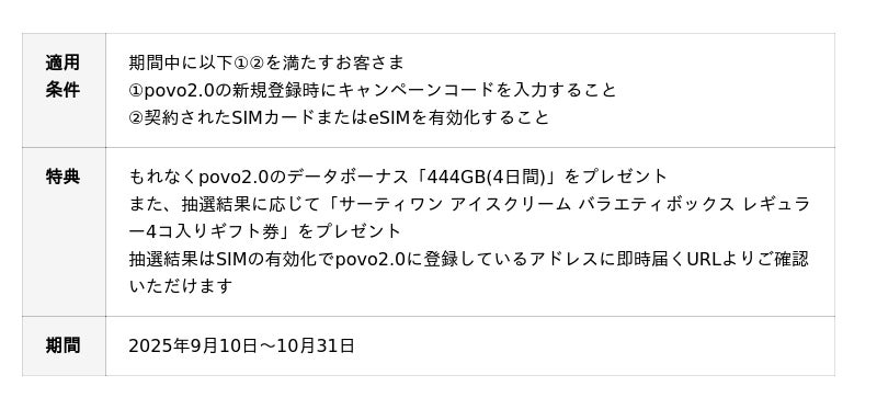KDDI、沖縄セルラーは2025年9月10日から、povo2.0の4周年を記念した新規登録キャンペーンを実施します。期間中povo2.0に新規登録いただくと、もれなく444GB(4日間)がもらえ、さらに抽選で「サーティワン アイスクリーム バラエティボックス レギュラー4コ入りギフト券」が当たります。