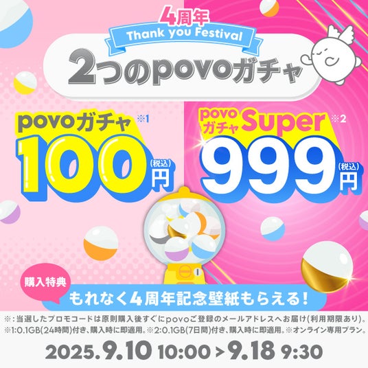 さらに、既にご契約中のお客さまを含め、期間中にpovoガチャを購入いただいた方全員にもれなく4周年記念壁紙をプレゼントします。