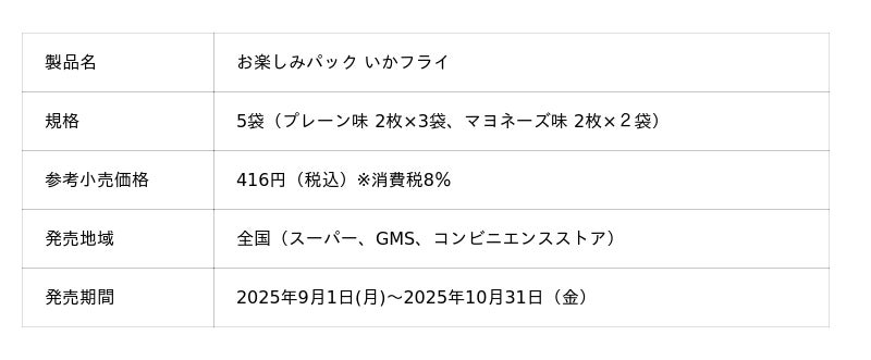 株式会社なとり(本社:東京都北区 会長兼社長:名取三郎)は、「お楽しみパック いかフライ」を9月1日(月)より期間限定で発売中です。