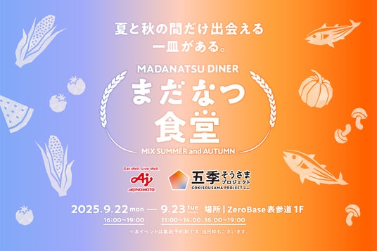 暦のうえでは秋を告げる9月23日「秋分の日」にあわせて、本プロジェクトのメインイベントとなる、「まだなつ食堂」by五季そうさまプロジェクトを、2025年9月22日(月)・23日(火・祝)の2日間、ZeroBase表参道にてオープンいたします。暦では秋でも、気温は夏のような暑さである「まだなつ」の時期に、秋の味覚と夏の定番料理を掛け合わせた新しい食体験をお楽しみいただけます。