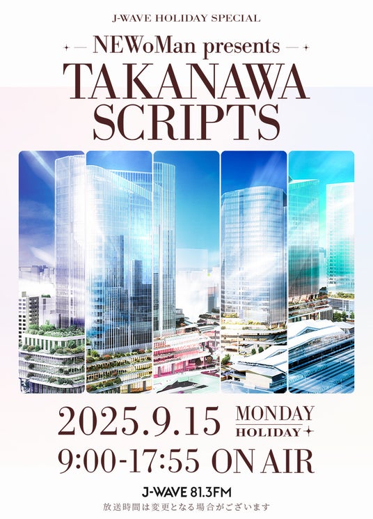 『J-WAVE HOLIDAY SPECIAL NEWoMan presents TAKANAWA SCRIPTS』と題し、100年先の未来を描く未完成のまちへの想いを馳せながら、「街の在り方」などについて考えるキッカケを創る、9時間生放送のスペシャルプログラムをお送りします。