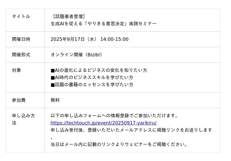 AI型次世代DAP「テックタッチ」を開発・提供し、DAP市場国内シェアNo.1のテックタッチ株式会社は、2025年9月17日(水)14時から、話題の書籍「やりきる意思決定 生成AIという『人間を超える知性』を従える究極のビジネススキル」の出版を記念し、著者であり当社 取締役 CPOの中出昌哉が登壇する、オンラインセミナーを開催します。
