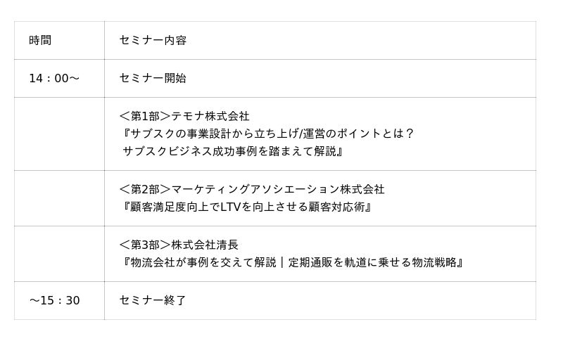 本セミナーでは、テモナ株式会社より「事業設計から立ち上げ・運営までの成功ポイントと事例」を、マーケティングアソシエーション株式会社より「顧客満足度を高めてLTVを向上させる顧客対応術とアウトソース活用事例」を、そして株式会社清長からは「事例を交えた定期通販を軌道に乗せる物流戦略」をそれぞれ解説します。