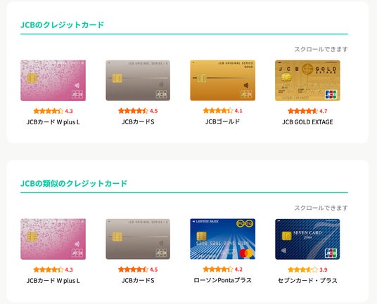 類似のクレジットカードは、年会費やポイント還元率などにおいて近い特性を持つクレジットカードを一目で確認することが可能です。