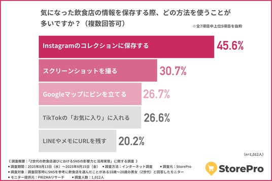 「気になった飲食店の情報を保存する際、どの方法を使うことが多いか」と尋ねたところ、『Instagramのコレクションに保存する(45.6%)』が最多で、『スクリーンショットを撮る(30.7%)』『Googleマップにピンを立てる(26.7%)』となりました。