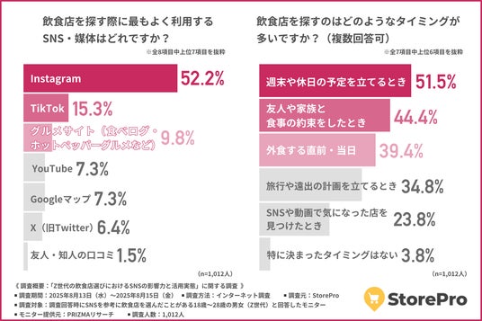飲食店探しのタイミングは休日の予定を立てるときや約束時、外食の直前などが中心で、即時性と柔軟性をもってSNSを活用する傾向が強まっています。
