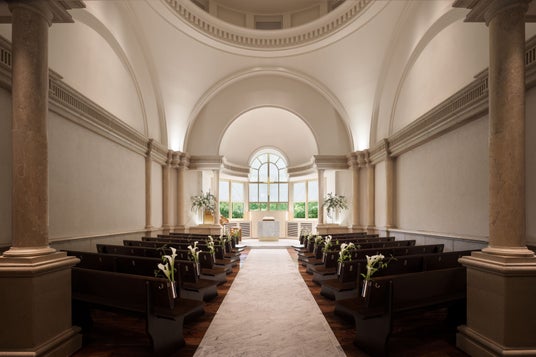 白い大理石のバージンロードの先、祭壇の奥の窓からは常緑樹を配したウェスティンガーデンが広がり、自然光が祭壇のホワイトオニキスを通して差し込むことで、昼は爽やかに、夕暮れには幻想的にと、時間帯ごとに異なる表情を見せます。また、これまで数多くの挙式を見守ってきたイエローオニキスを新たに十字架として祭壇に据えることで、30年間の想いを未来へとつなぎました。