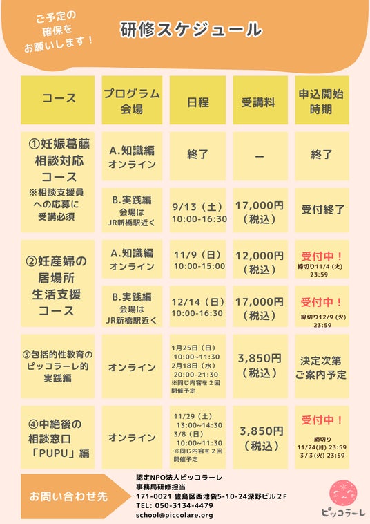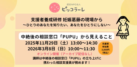 認定NPO法人ピッコラーレ(所在地:東京都豊島区、代表:中島かおり、以下ピッコラーレ)は、以下の日程で支援者養成研修 妊娠葛藤の現場から~ひとりのあなたを知りたい、あなたをひとりにしない~<中絶後の相談窓口「PUPU」から見えること>を開催します。