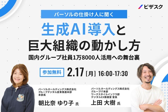 株式会社ビザスク(以下、当社)は、「パーソルの仕掛け人に聞く 生成 AI 導入と巨大組織の動かし方」をテーマに、パーソルホールディングス株式会社の朝比奈 ゆり子 氏、上田 大樹 氏 ご登壇による無料オンラインセミナーを 2/17 (月) 16:00より開催します。