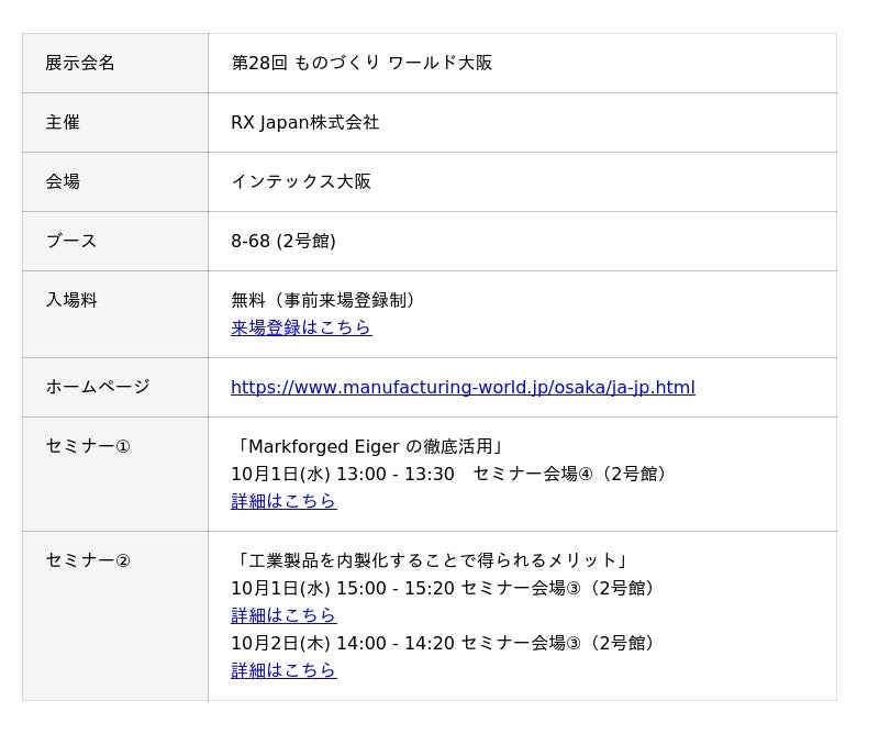 10月1日(水)15:00および10月2日(木)14:00より「工業製品を内製化することで得られるメリット」をテーマとしたセミナーも開催されます。