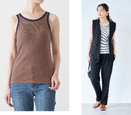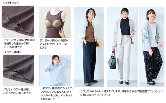 昨年初登場し、バリエーション拡充の声をいただくなど多くのお客様に支持された綿100%「ふんわりコットン」シリーズは、シアー素材など素材にこだわった新商品を揃え、「きこまぬコットン」シリーズとして拡大展開します。特殊な技術で加工した柔らかな綿と、吸湿発熱綿をブレンドしたベルメゾンオリジナル素材を使用した新商品は、糸の間に空気を含むことにより生まれるふわっと軽い着心地が特徴です。季節の端境期にあったかインナーを着こまなくても、これ1枚であたたかく過ごせる素材とデザインにこだわりました。様々なコーディネートで活躍するファッション性の高いアイテムとして、ブラトップとシアー素材の商品が新たに加わります。