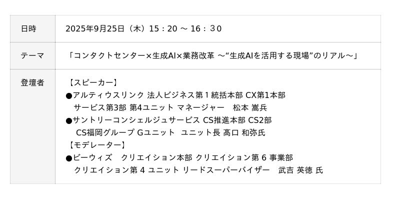 アルティウスリンク株式会社(所在地:東京都渋谷区、代表取締役社長:若槻 肇、以下アルティウスリンク)は、2025年9月25日(木)に一般社団法人日本コンタクトセンター協会(以下、CCAJ)が主催する「CCAJコンタクトセンター・セミナー2025 in福岡」のセッションに登壇します。