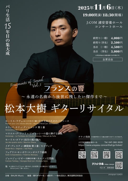 BAUM Music (BAUM音楽事務所)主催、『松本大樹 ギターリサイタル Fragments of Sound Vol.1』フランスの響 ~永遠の名曲から後世に残したい傑作まで~が2025年11月6日 (木)にJ:COM浦安音楽ホール コンサートホール(千葉県浦安市入船1丁目6番1号)にて開催されます。