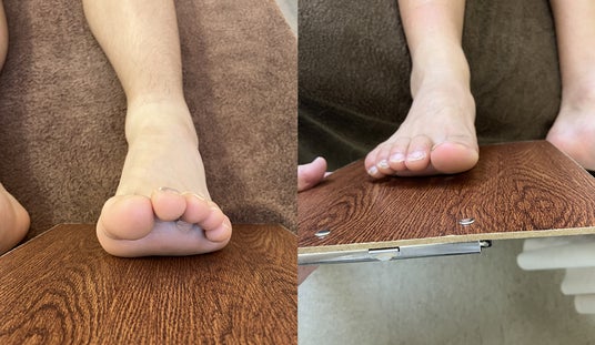 2.足の裏に下敷きなどの、まっすぐな板を当て、完全に力を抜いてもらう。