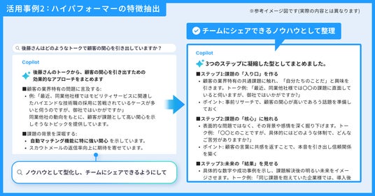 ハイパフォーマーによる、成功事例となるような話し方の見本を、複数の商談からまとめて抽出することができます。さらに、チャットで質問を重ねることで、ノウハウとしてチームにシェアできるように整理することができます。