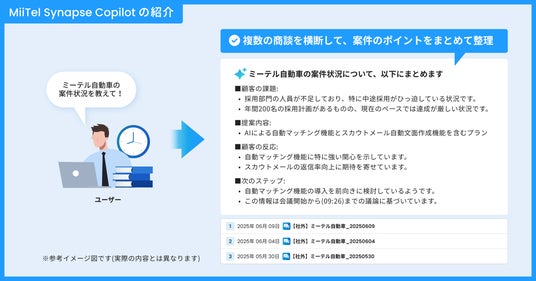 「MiiTel Synapse Copilot(ミーテル・シナプス・コパイロット)」は、Web会議解析AI「MiiTel Meetings」、対面会話解析AI「MiiTel RecPod」で蓄積した、複数の会議履歴を横断し、質問することができる機能です。