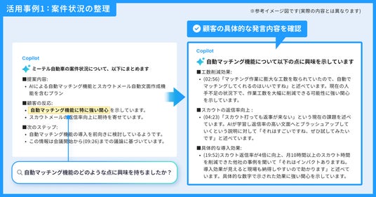 さらに、チャットで詳細を質問できるため、顧客が話した内容を正確に確認できます。これにより、やるべきことの抜け漏れを防ぎ、商談をスムーズに進められます。