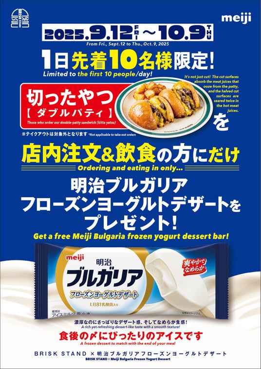 株式会社BRISK STAND(代表取締役:添田 有吾)が運営するハンバーガーショップ「BRISK STAND(ブリスクスタンド)」と株式会社 明治(代表取締役社長:八尾 文二郎)の「明治ブルガリア フローズンヨーグルトデザート」がコラボレーション企画を実施します。2025年 9月 12 日(金)~10 月 9 日(木)の期間中に「切ったやつ ダブルパティ」をご購入の方3,920名様に「明治ブルガリア フローズンヨーグルトデザート」をプレゼントします