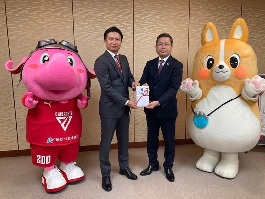 2025年9月10日(水)、当行本店にて、梅田頭取より田村社長へ寄付金目録を贈呈いたしました。寄付金は、千葉ジェッツふなばしが実施する地域貢献活動に役立てていただきます。