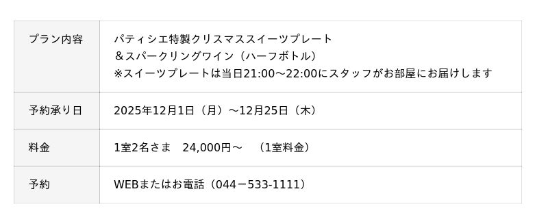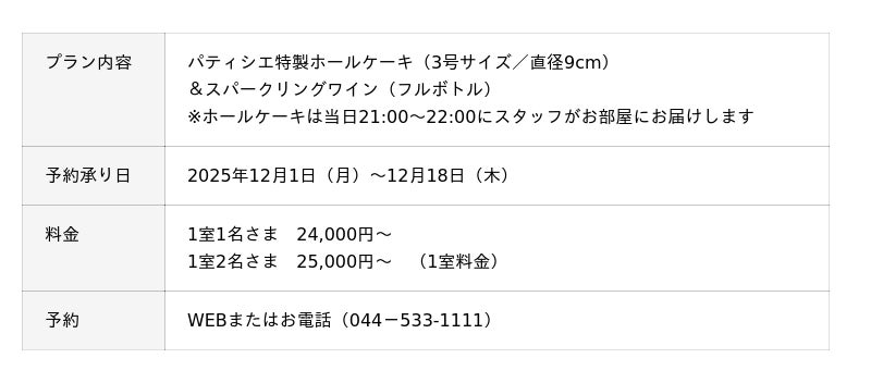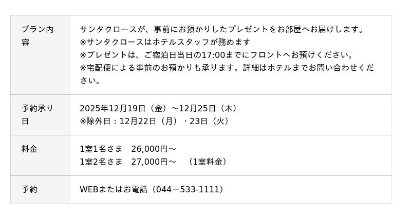 ホテルメトロポリタン 川崎(運営/日本ホテル株式会社、総支配人/金田 文典)は、大切な人と過ごす聖なる夜を彩る3つのクリスマス宿泊プランを、2025年9月11日(木)14:00より公式サイトにて販売開始いたします。