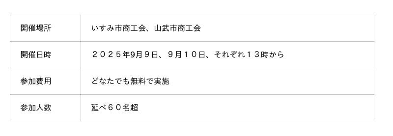 商売に役立つ千葉県商工会デジタル化支援事業、2025年9月9日、9月10日が開催された。以後印西市商工会、匝瑳市商工会、旭市商工会、鋸南町商工会、酒々井町商工会、富津市商工会にて順次実施予定