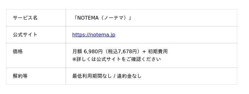 「NOTEMA(ノーテマ)」のサービス概要につきましては、公式サイトをご参照ください。ご相談は無料です。