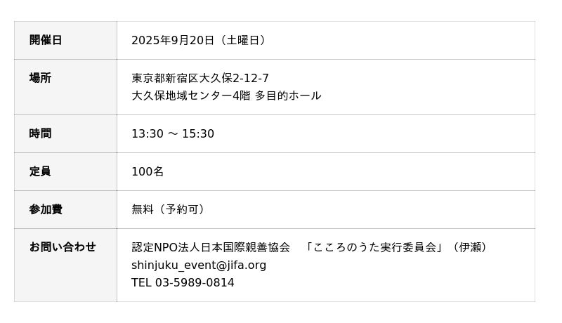 本事業は、令和7年度新宿区協働推進基金助成事業として実施するもので、外国人と日本人が日本文化を体験しながら交流するイベントです。単なる娯楽の場にとどまらず、互いの文化を理解し合うための新しい交流の形を生み出すことを目指します。