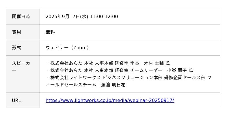 クラウド型学習管理システム(LMS)市場で売上シェアNo.1*の「CAREERSHIP」およびe ラーニングコンテンツを開発・提供する株式会社ライトワークス(本社:東京都千代田区、代表取締役:江口夏郎、以下ライトワークス)は、2025年9月17日(水)に無料ウェビナーを開催します。