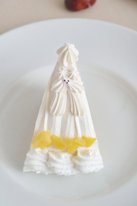 「和栗のマロンシャンティ〈ホワイトテリアのミルブラン〉」は、ほっくりとまろやかな甘みの和栗を贅沢に使ったマロンクリームを、ふんわり軽やかな生クリームで包み、「ホワイトテリア」の姿に仕立てた遊び心あふれるひと皿。