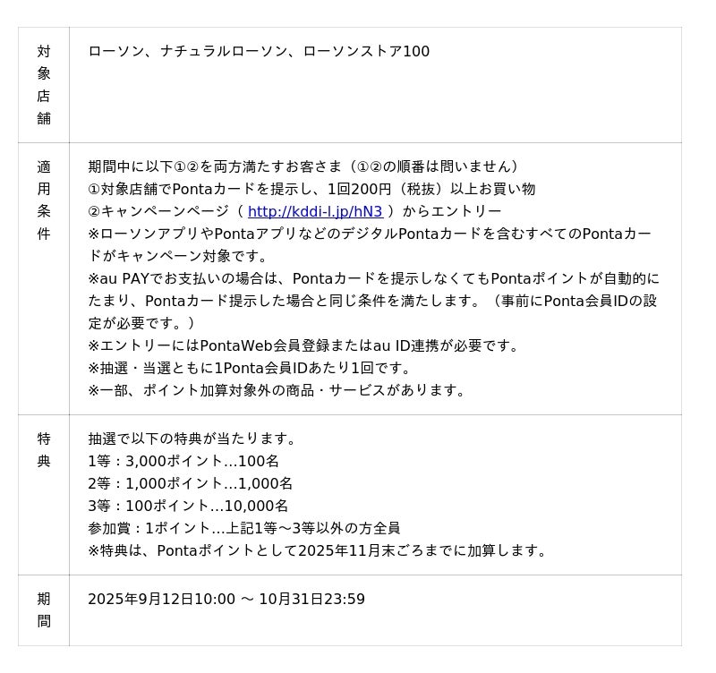 KDDI、ロイヤリティ マーケティング(以下 LM)は2025年9月12日から10月31日まで、もれなく最大3,000Pontaポイントが当たるキャンペーン(以下 本キャンペーン)を実施します。
