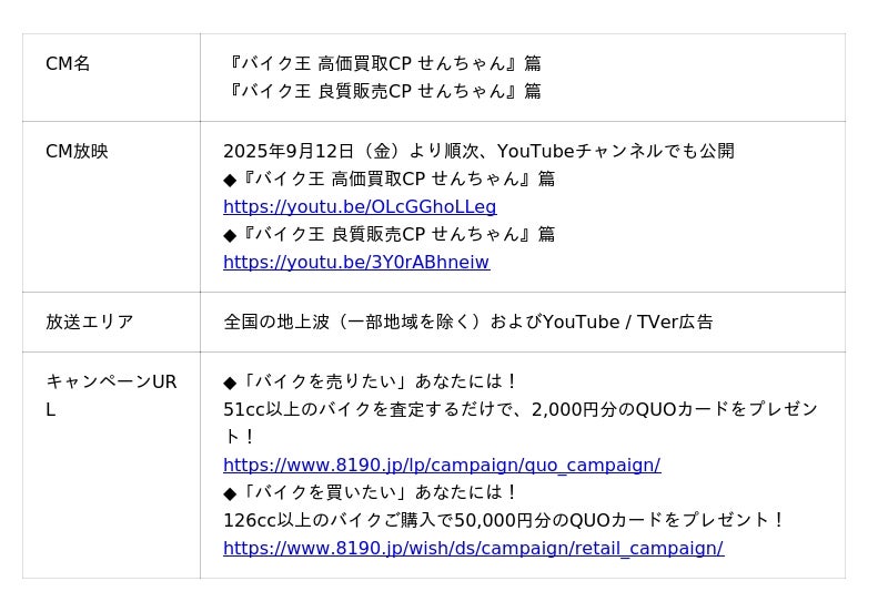 「まだ世界にない、感動をつくる。」をコーポレートミッションに掲げ、ビジョンである「バイクライフの生涯パートナー」の実現に向けて、事業を展開する株式会社バイク王&カンパニー(代表取締役CEO:澤 篤史、本社:東京都世田谷区、証券コード:3377、以下「当社」)は、2025年9月12日(金)~10月19日(日) まで開催する、売っても買ってもお得な大感謝祭にあわせ、2025年9月12日(金)より、人気バイク系YouTuberの「せんちゃん」が登場する新CM『バイク王 高価買取CP せんちゃん』篇、『バイク王 良質販売CP せんちゃん』篇の2種を放映開始します。