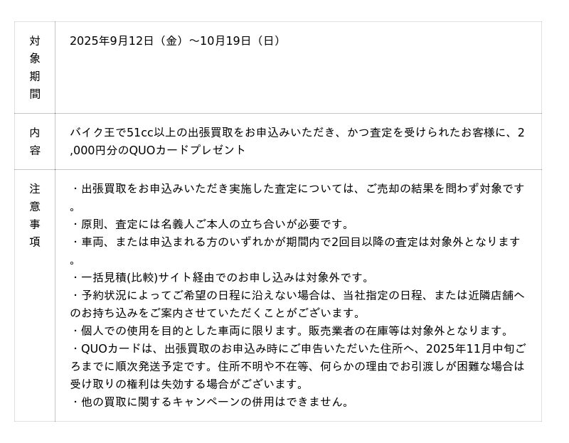 期間中、当社で51cc以上のバイクの出張買取をお申込みのうえ査定をされた方を対象に、2,000円分のQUOカードをプレゼントいたします。