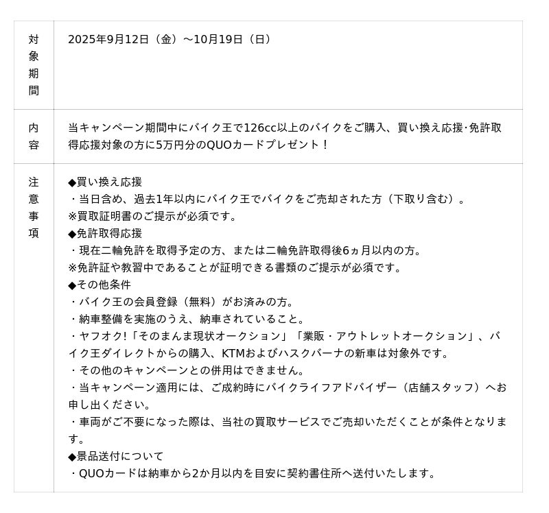 当社で過去1年以内に126cc以上のバイクを売却された方※1や、二輪免許を取得予定の方を対象※2として、当キャンペーン期間中にバイク王で126cc以上のバイクを購入された場合、50,000円分のQUOカードをプレゼントいたします。
