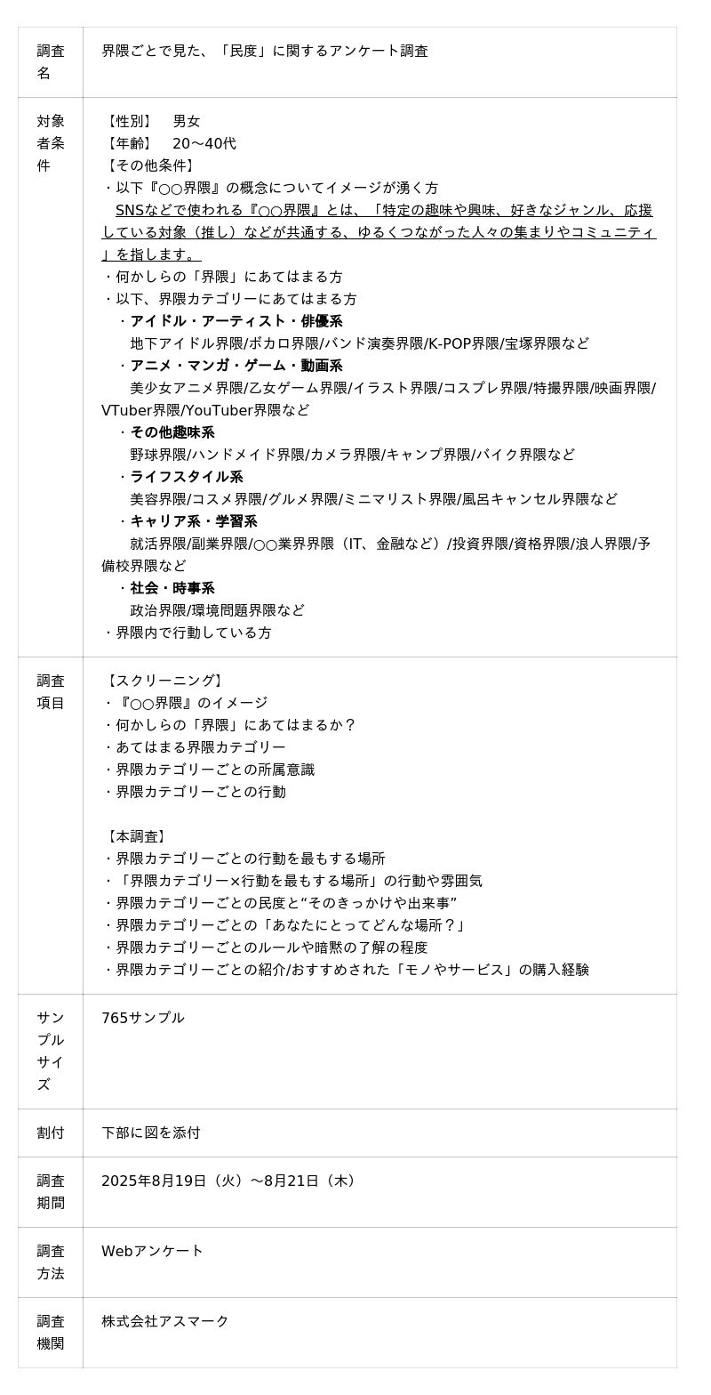 今回は、特定の界隈カテゴリー内で行動をしている方(詳しい対象者条件は下表の調査概要に記載)に、行動を最もする場所(XやInstagramなど)、民度と“そのきっかけや出来事”、ルールや暗黙の了解の程度、紹介/おすすめされた「モノやサービス」の購入経験について調査しました。