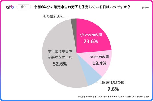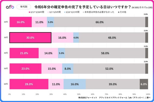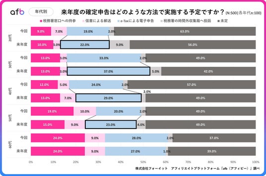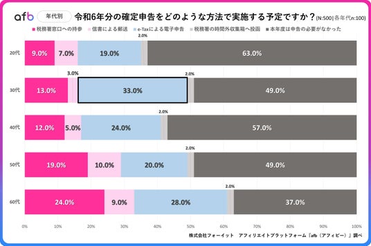 アフィリエイトプラットフォーム「afb(アフィビー)」< https://www.afi-b.com/ >の開発運用をおこなう株式会社フォーイットは、全国の20代~60代までの男女500人を対象に確定申告に関するアンケートを実施し、年代別等の特徴についてまとめました。