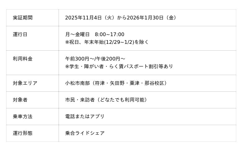 本事業では、石川県小松市南部地区(符津・矢田野・粟津・那谷校区)を対象に、平日日中の新たな移動手段として「乗合ライドシェア」の実証運行を開始します。地域住民の日常的な移動手段を確保するとともに、観光客など来訪者の交通ニーズにも応えることで、路線バスの大幅な減便やドライバー不足といった、交通空白地域の課題解決に取り組みます。