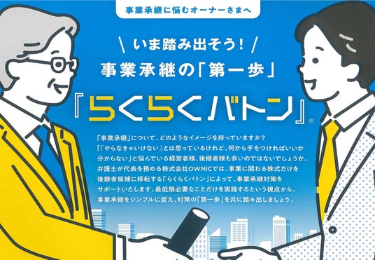 弁護士が代表を務める株式会社OWNIC(本社:東京都新宿区、代表取締役:田村 和之)は、中小企業の円滑な事業承継をシンプルかつスピーディーに実現する新サービス『らくらくバトン』の提供を開始しました。