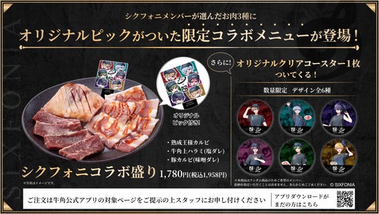 今回のコラボ限定メニュー「シクフォニコラボ盛り」は、メンバーが厳選した牛角自慢の3種の焼肉セットとなっております。オリジナルデザインの“シクフォニピック”を添えた一皿は、味覚だけでなく視覚からも“推し活”を盛り上げてくれる存在に。さらに、限定メニュー1品注文ごとに、「描き下ろしオリジナルコースター(全6種)」をランダムで1枚プレゼント。ここでしか手に入らないため、ファン必見の描き下ろしコースターとなっております。