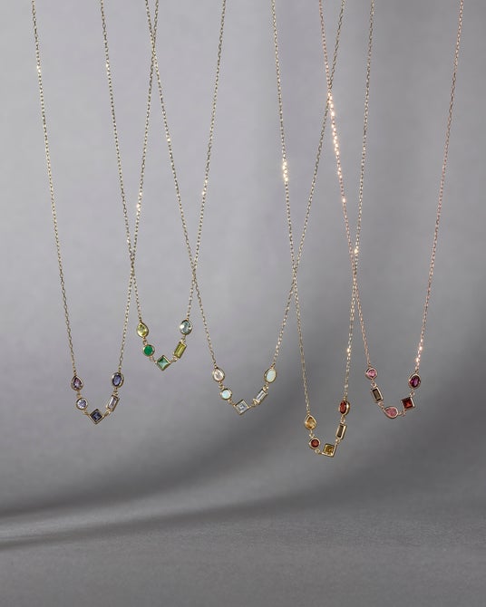 オープンを記念し、5石のカラーストーンをあしらったネックレス(全5種)を全国に先駆けて先行発売。アメシストやシトリンなど、石のうるうるとした透明感を感じられるデザインです。