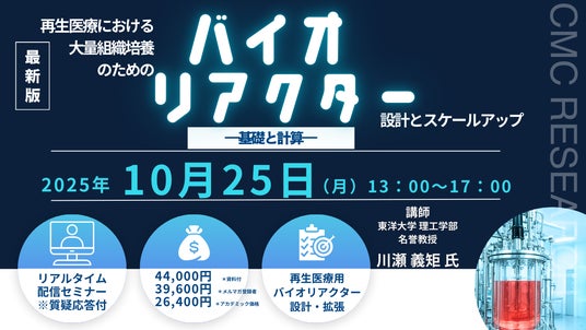【ライブ配信/ZOOM】「再生医療における大量組織培養のためのバイオリアクターの設計とスケールアップ―基礎と計算―」セミナー開催!10月21日(火)主催:(株)シーエムシー・リサーチ