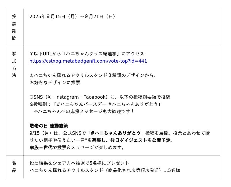 賃貸住宅仲介業店舗数No.1*のApaman Network株式会社(以下、当社)(東京都千代田区、本社:APAMAN株式会社の連結子会社、代表取締役社長:山崎 戒)は、公式キャラクター「ハニちゃん」のファーストバースデー(10月6日誕生日)を記念し、ファン投票で商品化を決める参加型企画「ハニちゃん グッズ総選挙」第二弾を実施します。投票は2025年9月15日(月)~9月21日(日)。期間初日の敬老の日に合わせ、“ありがとう”の気持ちを贈れるデザイン提案を呼びかけ、家族三世代で楽しめる参加体験を提案します。