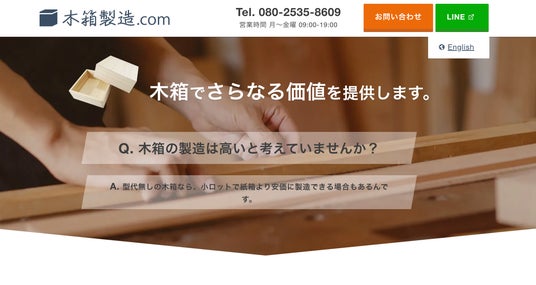 「木箱製造.com」(https://kibako-seizo.com/)は、法人・個人問わず、小ロットから日本の伝統的な木箱のオーダーメイドが可能なオンラインEコマースサービスです。商品の外装箱、美術品の収納など、様々な用途に合わせた木箱を、お客様の要望に応じて柔軟に製造します。