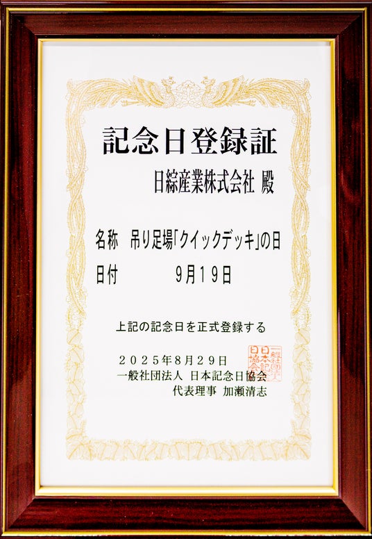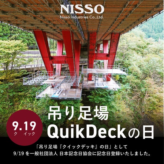 日綜産業株式会社(本社:千葉県千葉市、代表取締役社長:小野 大)は、 9月19日を「吊り足場『クイックデッキ』の日」として、一般社団法人 日本記念日協会に記念日登録いたしました。本製品は、NETIS準推奨技術(TH-150007-VE)で、従来の吊り足場の課題を解決し、作業員の安全性と生産性向上に貢献します。本記念日は、全国で老朽化が進むインフラのメンテナンス需要が高まる中、安全かつ効率的な施工を支える吊り足場技術の社会的意義と、当社を代表する先行床施工式フロア型システム吊足場「クイックデッキ」への理解促進を目的としています。なお、日付は「クイックデッキ」の語呂合わせ「9(ク)1(イ)9(ック)」にちなんでいます。