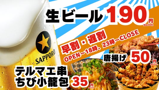 ■鶏皮串、唐揚げ、小籠包等テルマエ名物5種が早割・遅割で1品35円~!?